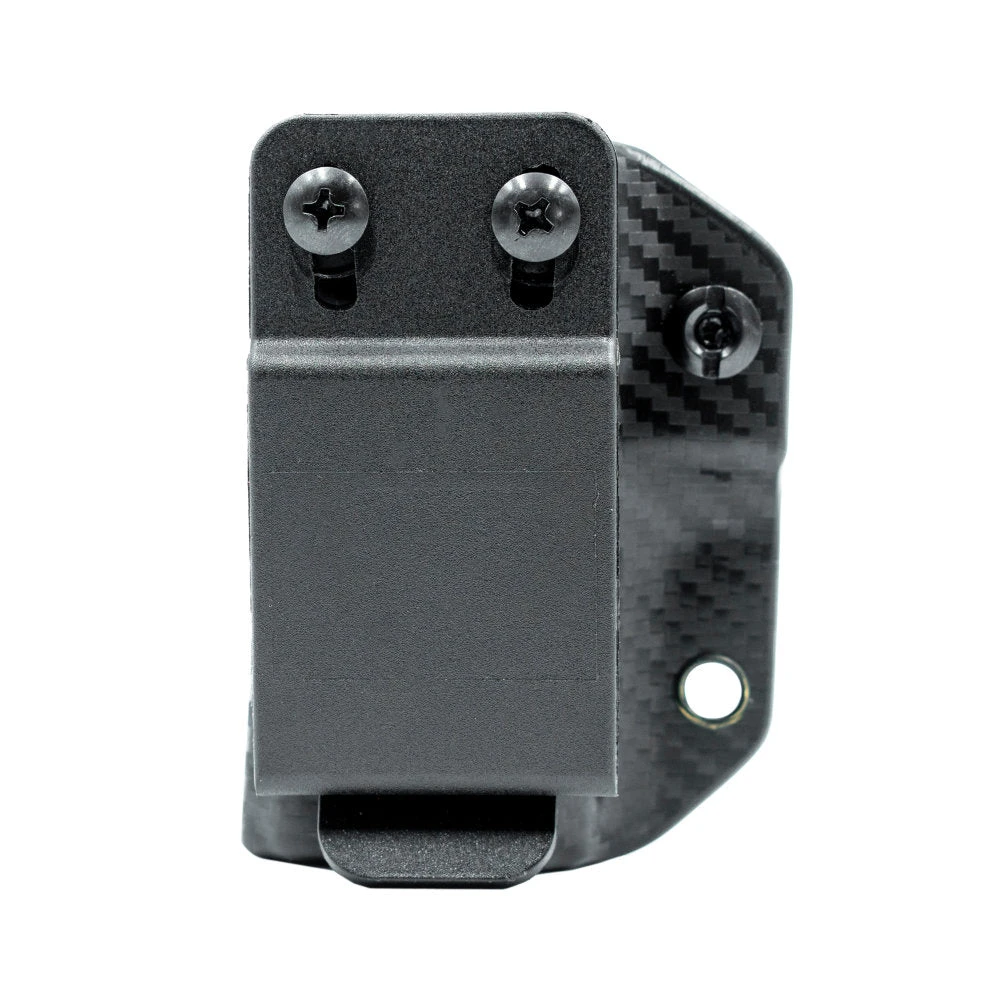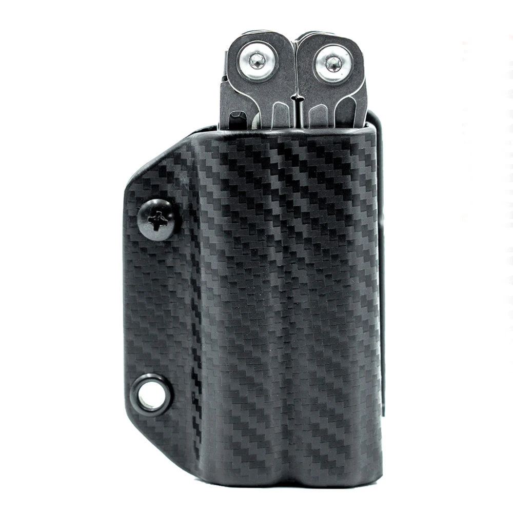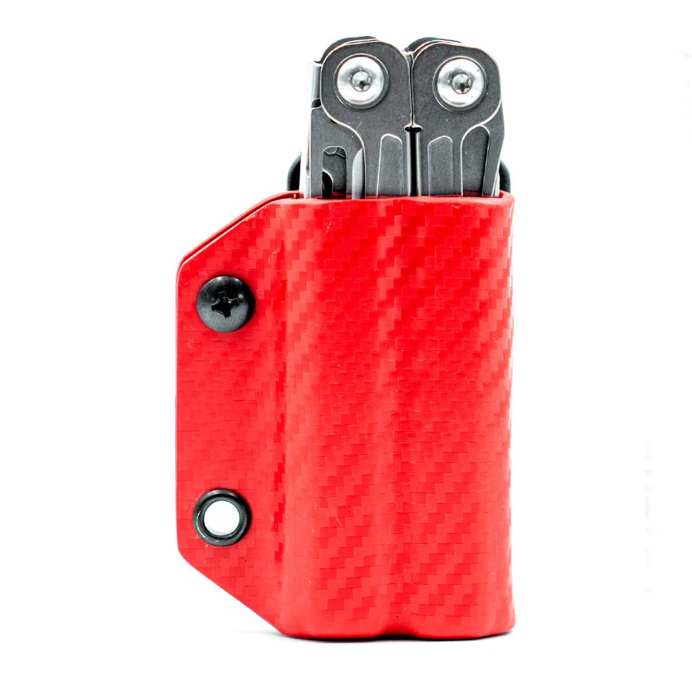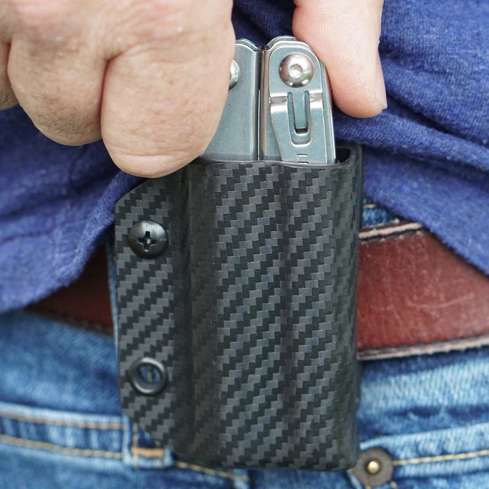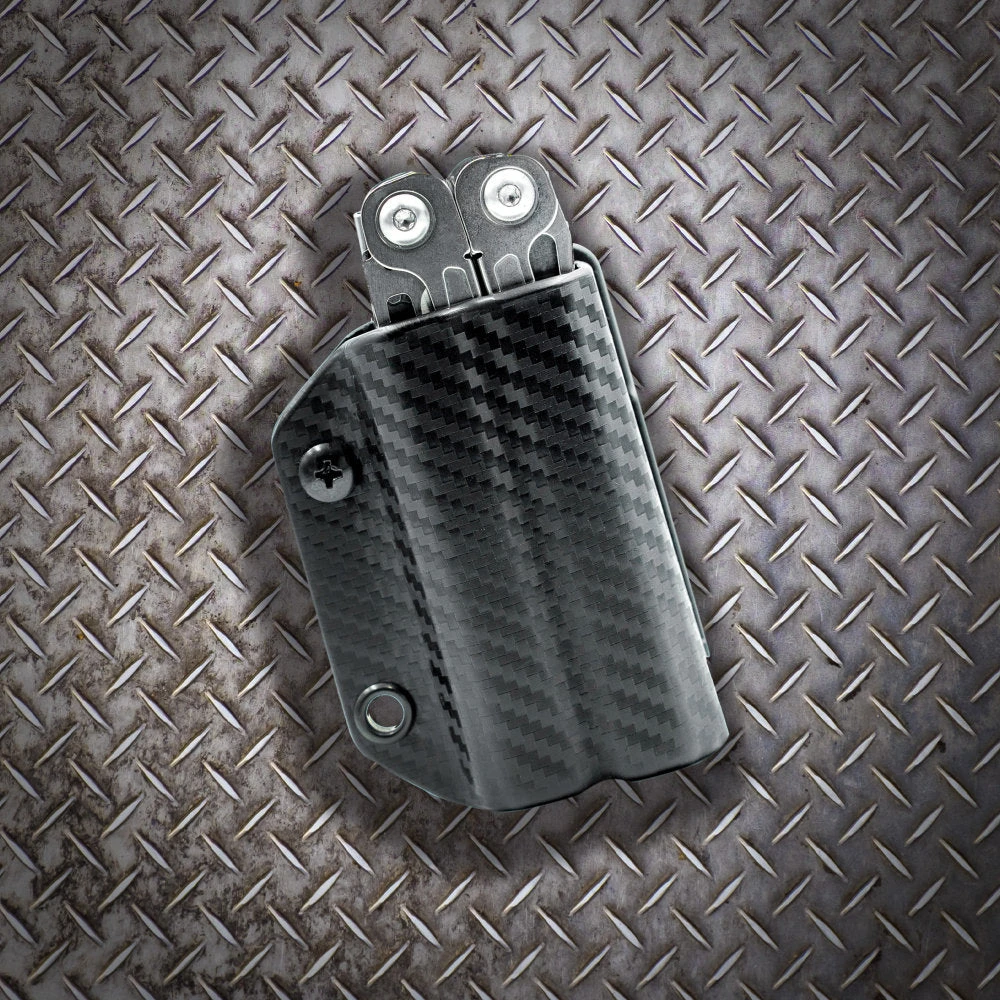 This Clip & Carry Kydex Sheath is designed to fit the Leatherman Wingman, Sidekick, Rebar or Rev. It is proudly constructed in the USA from a durable kydex material, and can be adjusted to your preferences.
