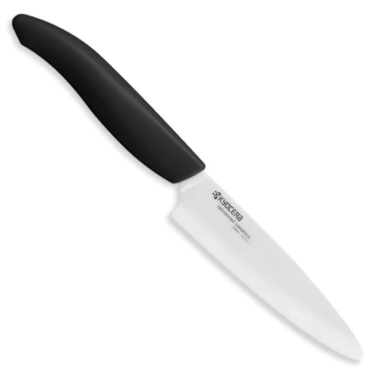 The Kyocera Revolution Series Ceramic 4.5″ Utility Knife features a razor-sharp, exceptionally strong, lightweight ceramic blade. This ceramic blade, made from Kyocera’s proprietary Japanese ceramic, zirconium oxide, is inert, and will not discolor food or alter its taste. In addition, the blade will never rust, corrode or pit. Made of ceramic that is ground very fine and highly polished, it will retain its sharpness at least 10 times longer than any other blade – including one made from high carbon steel.