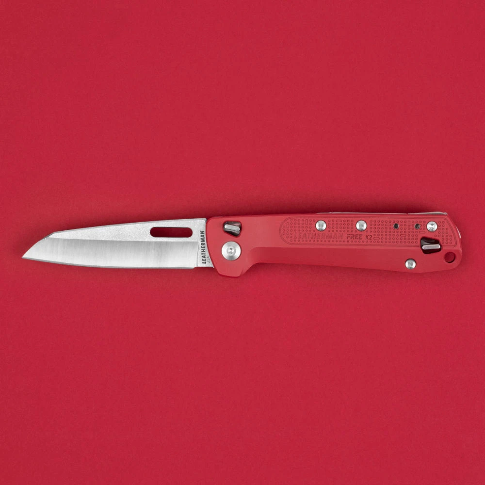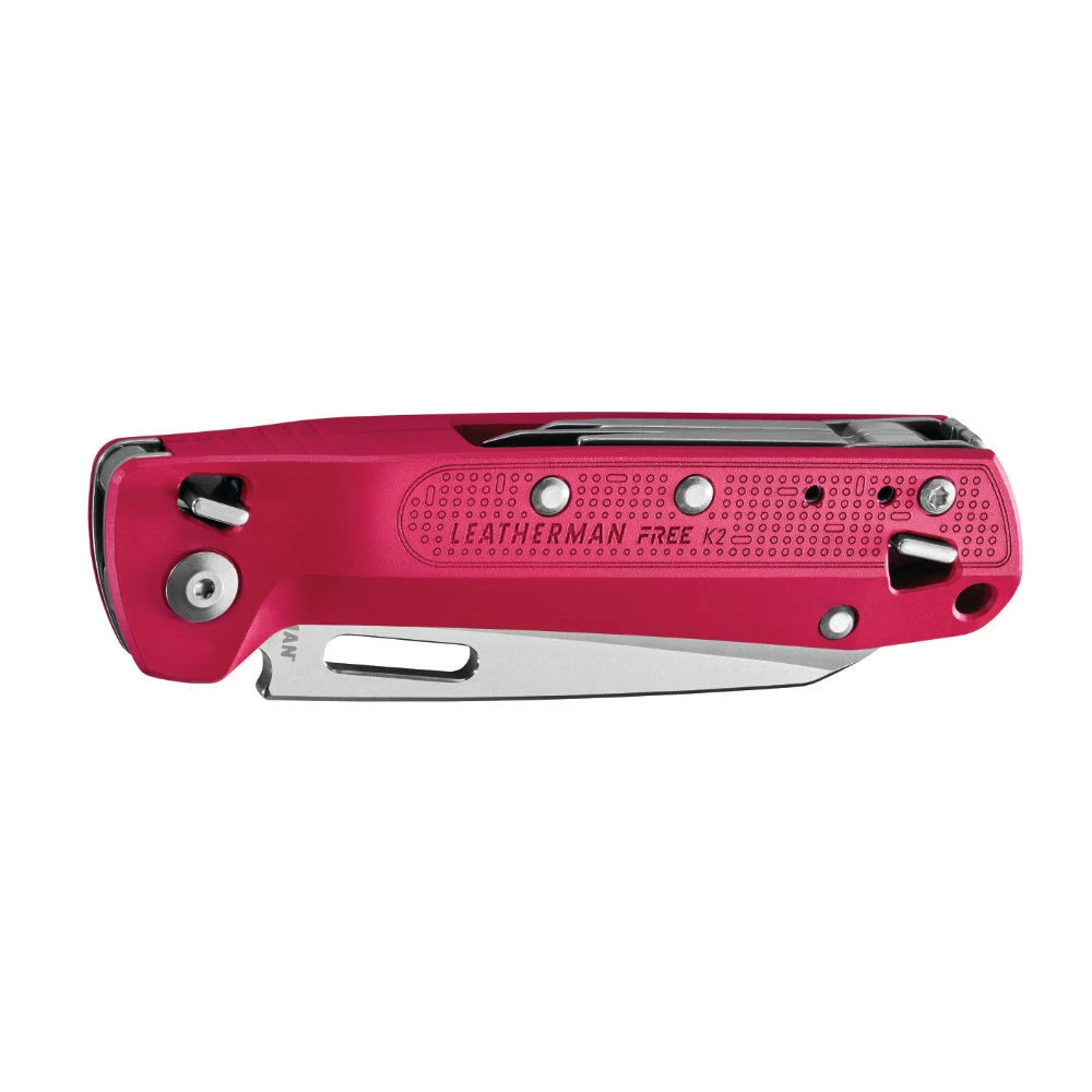 The Leatherman FREE K2 Crimson Multipurpose Knife is much more than a simple knife. This innovative multi-tool includes DIY essentials such as a knife blade, an awl, a robust pry tool and more. Each of the 8 tools built into this multi-tasker open smoothly with one hand, lock in the open position while in use, and snap back into place when the job is done.