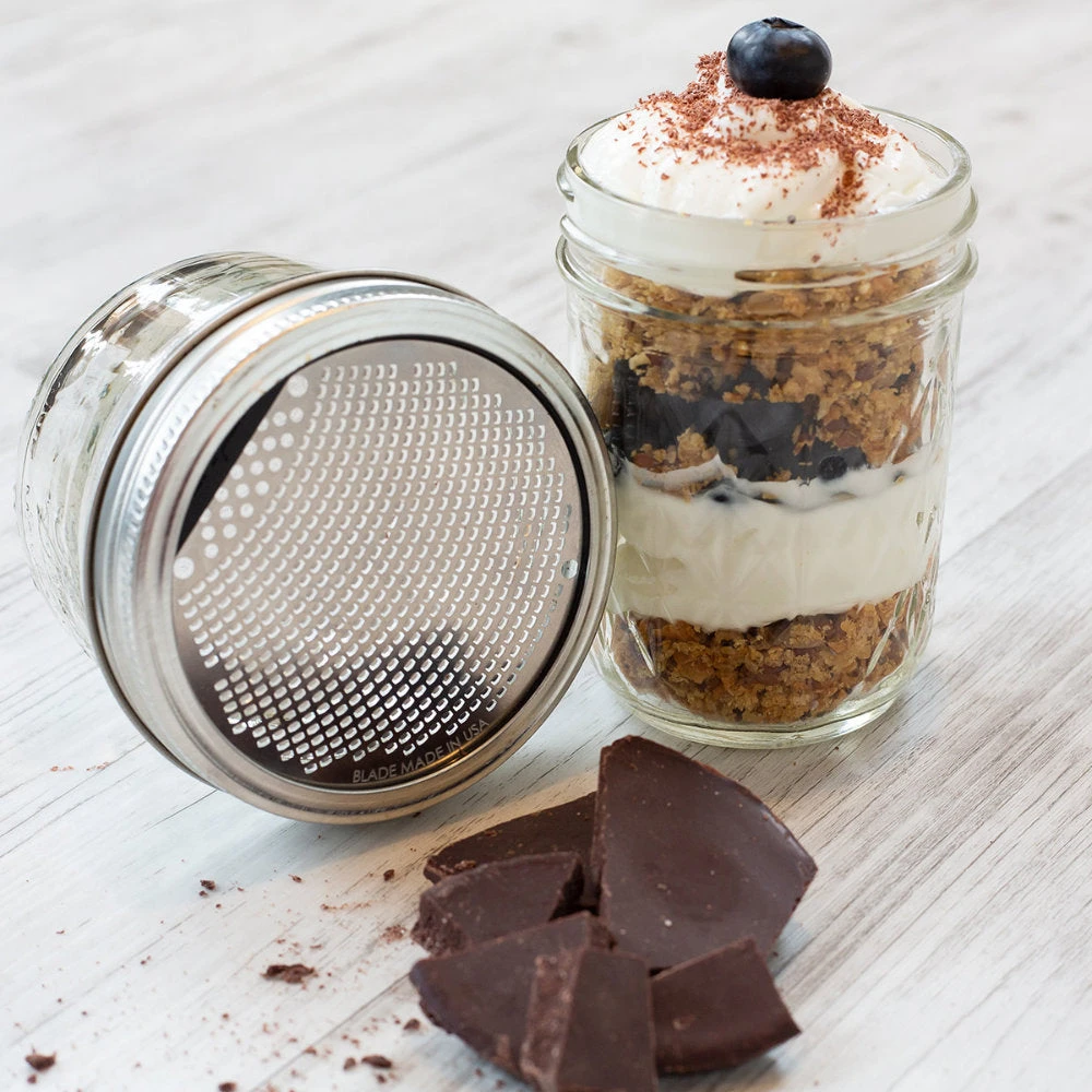 These graters are perfect for making on-the-go jar salads, as well as spice rubs and vinaigrettes. Simply use the jar lid ring to secure the grater to the top of your jar, and grate right into the jar.