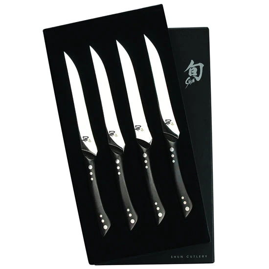 The Shun Shima 4-Piece Steak Knife Set is the perfect answer to the perfectly grilled steak. The incredibly sharp, clean 16-degree edge of the Shun Shima Steak Knife glides easily through even the toughest meat, keeping flavor where it belongs. This steak knife is not serrated, and can be sharpened to perform like new even after years of use.