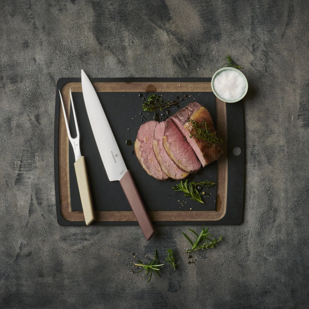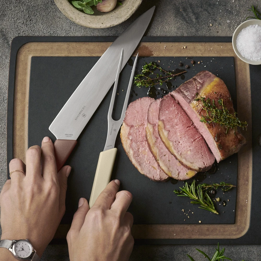 The Swiss Modern Colors 2-Piece Carving Set by Victorinox includes an 8.5-inch carving knife with a grape red handle, and a 6-inch carving fork with an almond beige handle. This set, designed to carve roast beef, turkey or any larger meats in the kitchen or table-side, features handles with a fresh Scandinavian color scheme to brighten any occasion.
