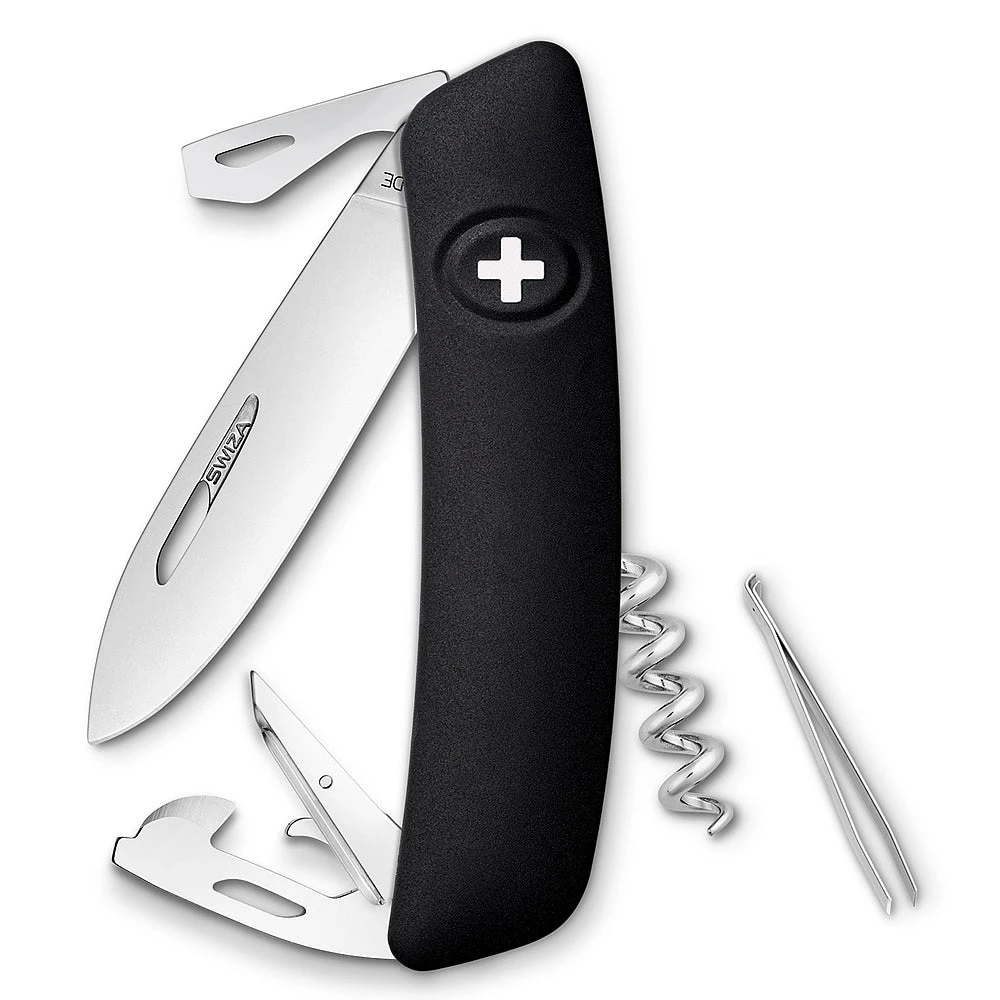 The Swiza D03 Swiss Pocket Knife is an authentic Swiss Knife with a unique new design. The D03 features a long (2.95 inch), strong, locking stainless steel blade and 5 other implements housed in ergonomic, soft-touch handles. The blade’s die-cut slot makes it easy to open with either your left or right hand, and the Swiza Swiss cross logo on the handle is a safe, convenient blade lock release.