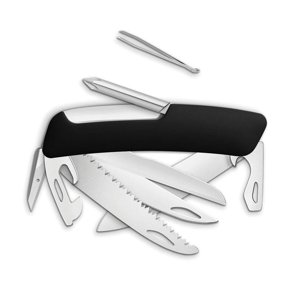 The Swiza D10 Black Swiss Pocket Knife is an authentic Swiss Knife with a unique new design created for those who want it all. The D10 is packed with functions, and features a long (2.95 inch), strong, locking stainless steel blade and 7 other implements housed in ergonomic, soft-touch handles.