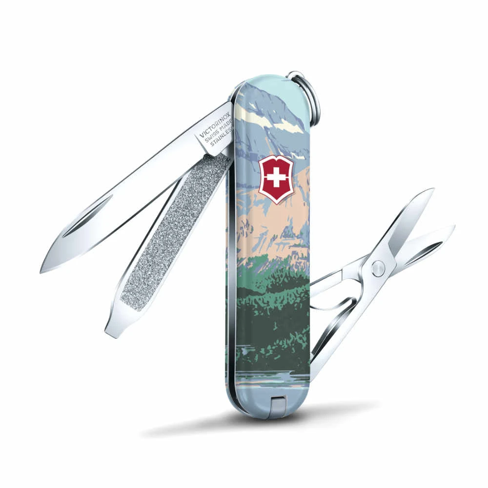 The Glacier National Park Poster Art Classic SD Swiss Army Knife by Victorinox is a special edition Classic SD features the artwork of Doug Leen, AKA “Ranger of the Lost Art,” who strives to educate people about the importance of nature conservation. A former Grand Teton National Park Ranger, Doug Leen created this unique silk-screen reproduction of the New Deal Era National Park poster for Glacier National Park.