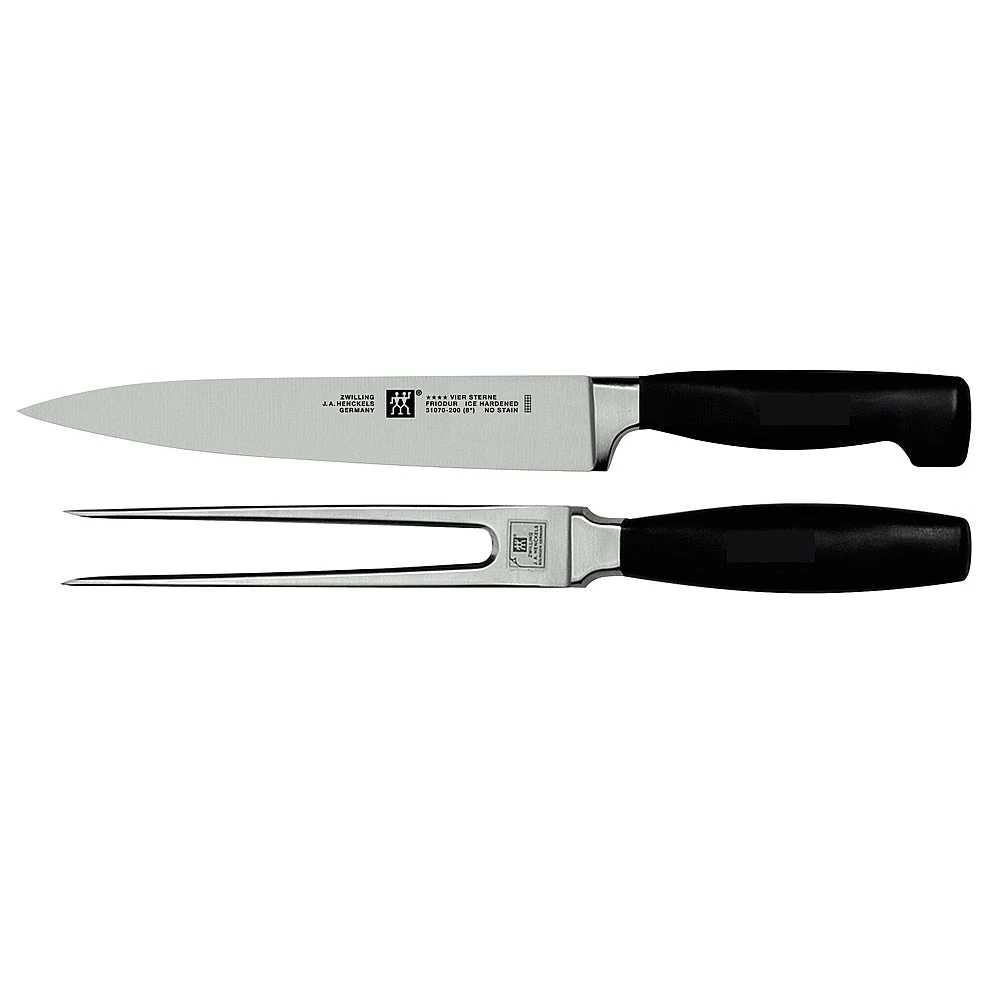 The Zwilling TWIN Four Star 2-Piece Carving Set includes an 8″ Carving Knife and a 7″ Carving Fork.