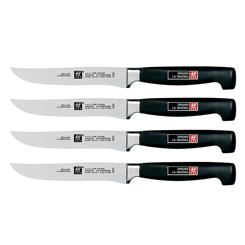 The Zwilling TWIN Four Star 4-Piece Steak Knife Set features four steak knives with 4.5-inch blades. These knives cut easily through any steak or fillet.